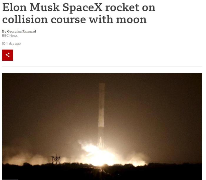 综合报道,负责推算火箭撞月球碰撞过程的专家预测,美国太空探索技术公司(SpaceX)的猎鹰9号助推器在太空漂流7年后,将在2022年3月撞上月球。