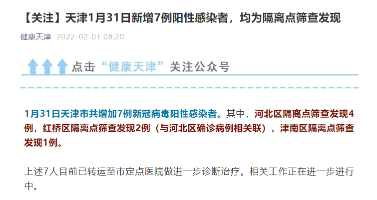 天津新增7例阳性感染者,均为隔离点筛查发现 2022-02-01 08:48 0 1月31日天津市共增加7例新冠病毒阳性感染者。其中,河北区隔离点筛查发现4例,红桥区隔离点筛查发现2例(与河北区确诊病例相关联),津南区隔离点筛查发现1例。 上述7人目前已转运至市定点医院做进一步诊断治疗。相关工作正在进一步进行中。 来源:健康天津