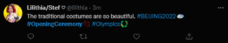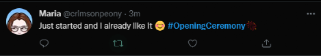 开幕式正式拉开帷幕后,有外国网友忍不住发推表示:“才刚刚开始,我就已经喜欢上(这届开幕式)了。”↓