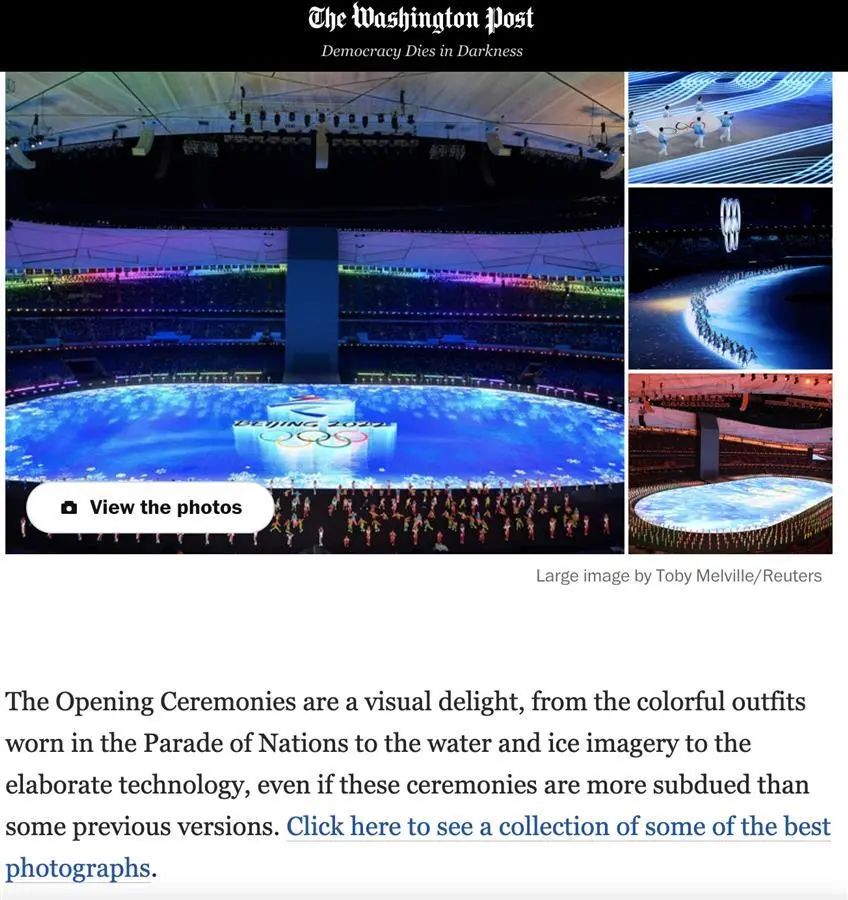 《华盛顿邮报》对北京冬奥会开幕式进行了详尽的报道,并拍摄了大量现场照片。报道称,开幕式是一种视觉享受,从各国游行时穿的五颜六色的服装,到水和冰的图像,再到精心制作的技术,这次开幕式更加柔和。