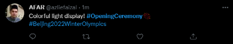 马来西亚网友对开幕式上的灯光表示印象深刻:“五彩斑斓的灯光秀!”↓