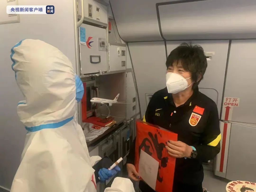 在回国的飞机上,女足姑娘们唱起了《我和我的祖国》,和主教练水庆霞一起围着蛋糕合影。
