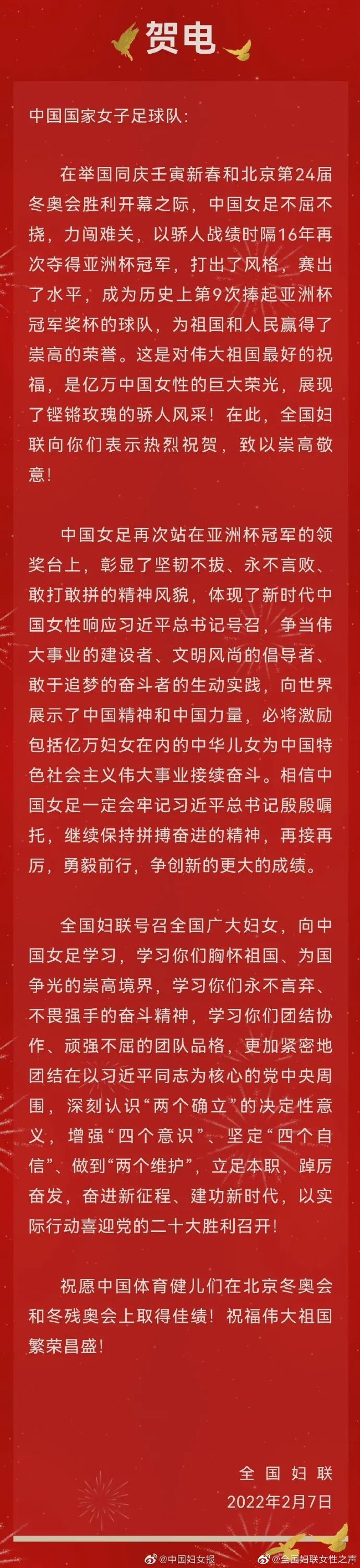 2月7日,全国妇联致电中国国家女子足球队,热烈祝贺中国女足获得2022女足亚洲杯冠军。