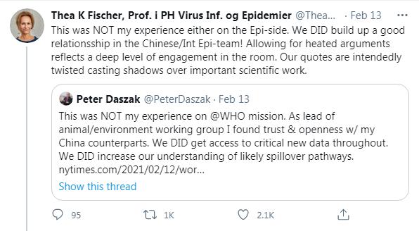 达萨克在社交媒体推特上表示:“这不是我在世卫组织任务中的经历。作为动物及环境工作组的负责人,我感到中国同行们值得信任,感受到他们的坦率。我们的确获得了关键的新数据,也增加了有关病毒传播途径的了解。”菲舍尔转发了这条推特。