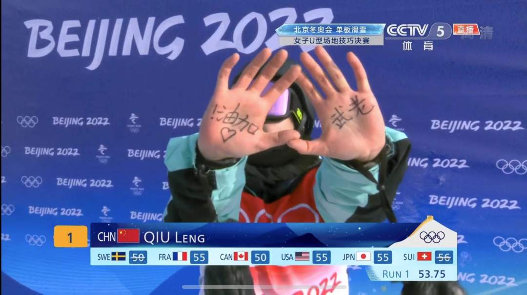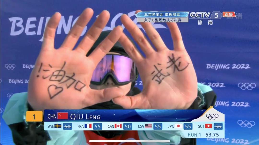 为姑娘们点赞!邱冷手掌写字为未晋级队友加油 2022-02-10 10:26 0 刚刚,在单板滑雪女子U型场地技巧决赛第一轮中,率先出场的中国队选手邱冷完成动作后,对着镜头亮出双手手掌,邱冷手掌上写着老武加油。昨天的资格赛,她的队友武邵桐遗憾未能晋级。邱冷用这样的方式表达自己与队友的团结友爱。加油,姑娘们! 来源:人民日报客户端