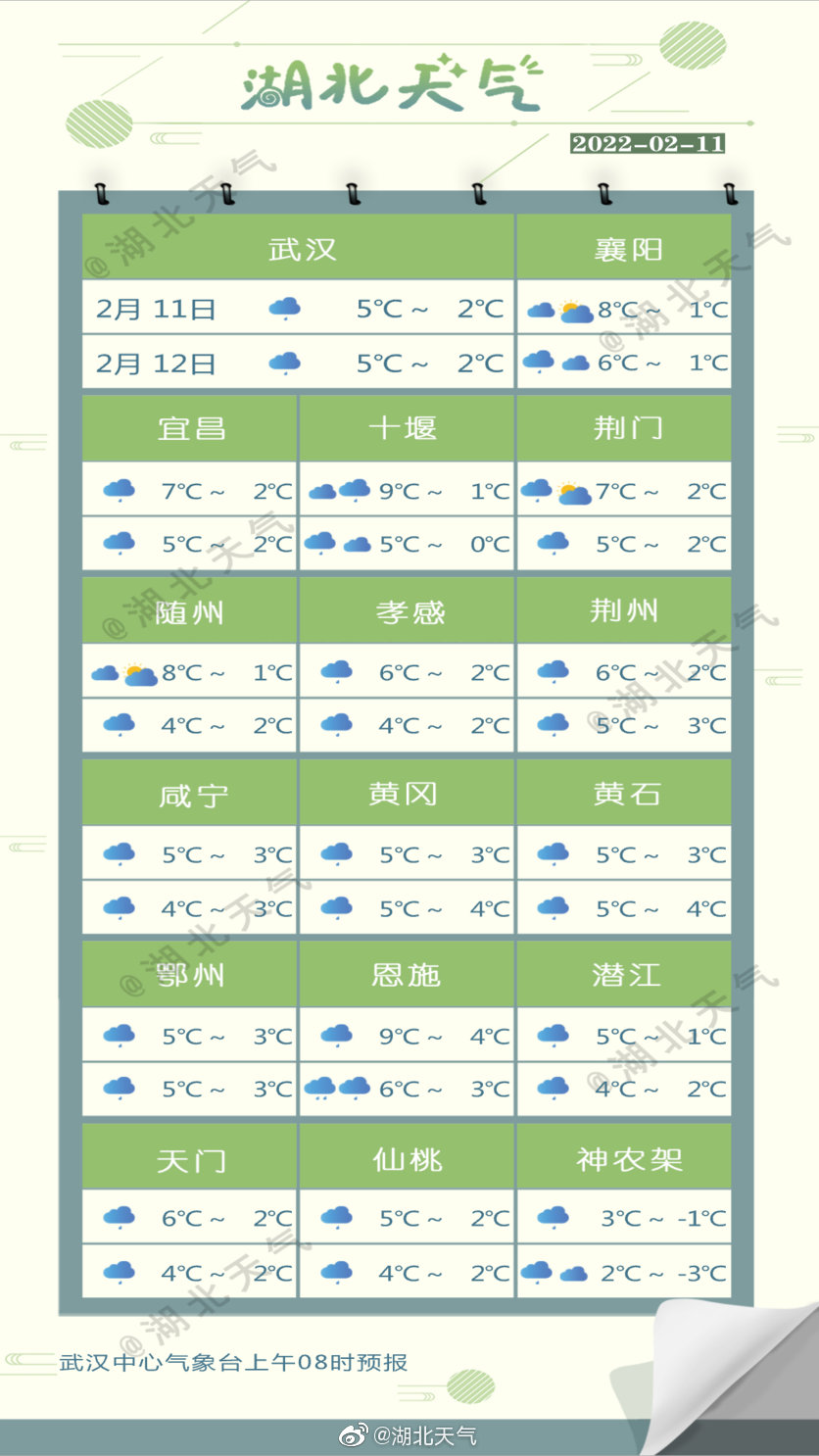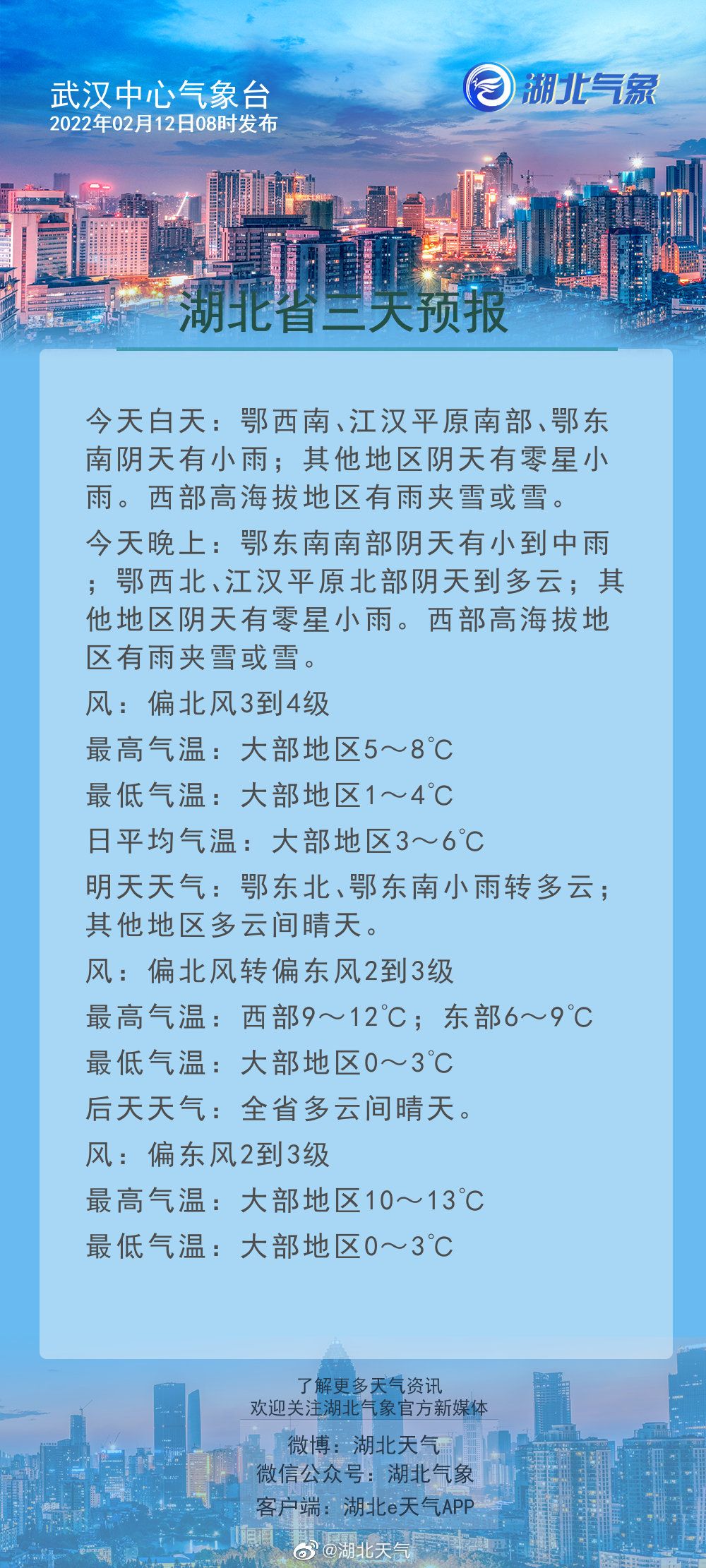 据武汉中心气象台预计,最近两天,受中低层切变线影响,湖北大部地区仍然天空阴沉,有降水发生,其中西部高海拔地区有雨夹雪或雪;13日,西部天气转为多云,而东部也降水渐止。未来三天气温小幅波动,大部分地区最高气温在4-9℃,西部可达9-12℃,而北部最低气温在0℃上下,南部在2-4℃。