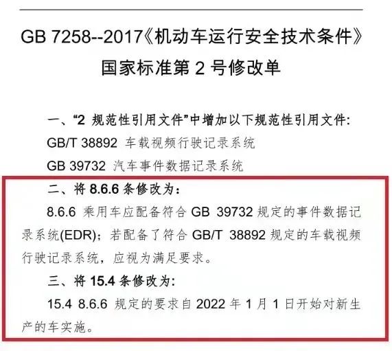 《机动车运行安全技术条件》国家标准第2号修改单规定,从今年1月1日起,国内新生产的乘用车要配备符合要求的“EDR”。这个装置俗称汽车黑匣子,当车辆发生碰撞或者速度剧烈变化时,就会被触发,开始记录。