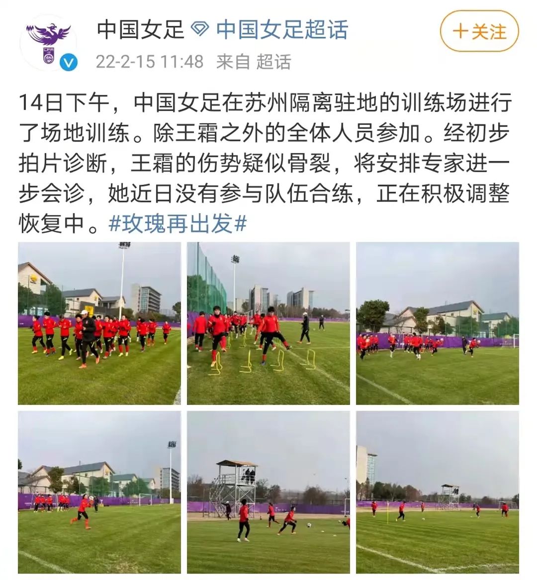 就在15日中午,中国女足官方微博发布了球队在隔离区内开始恢复训练的消息。同时透露,经初步拍片诊断王霜的伤势疑似骨裂,将安排专家做进一步会诊。
