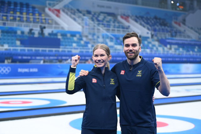 2月8日,瑞典队选手奥斯卡·埃里克松(右)和阿尔米达·德瓦尔在北京冬奥会冰壶混双铜牌赛后庆祝获胜。新华社记者黄孝邦摄