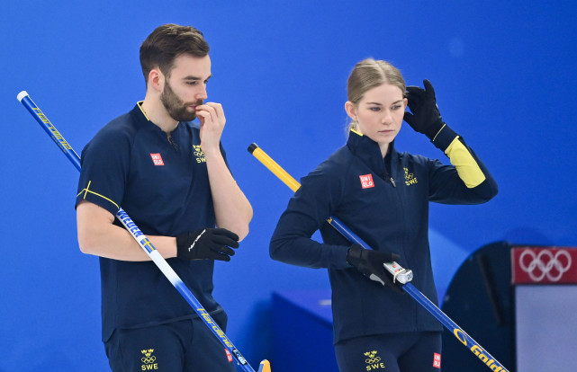 2月8日,瑞典队选手奥斯卡·埃里克松(左)和阿尔米达·德瓦尔在北京冬奥会冰壶混双铜牌赛中。新华社记者黄孝邦摄