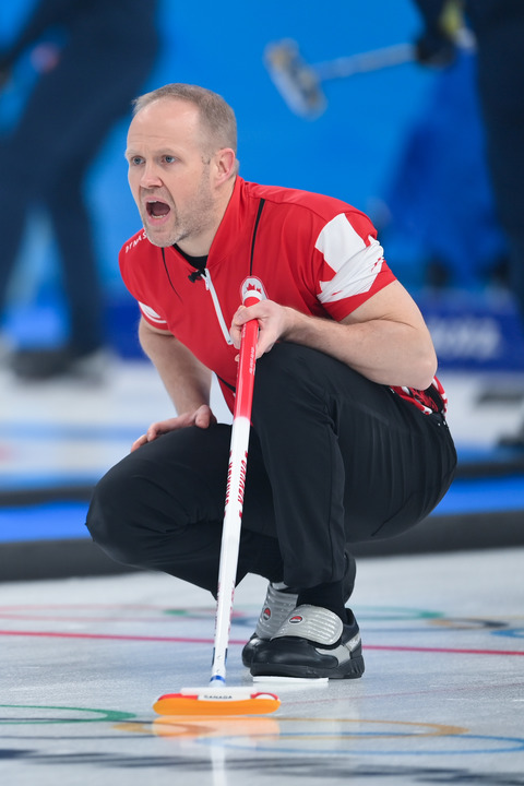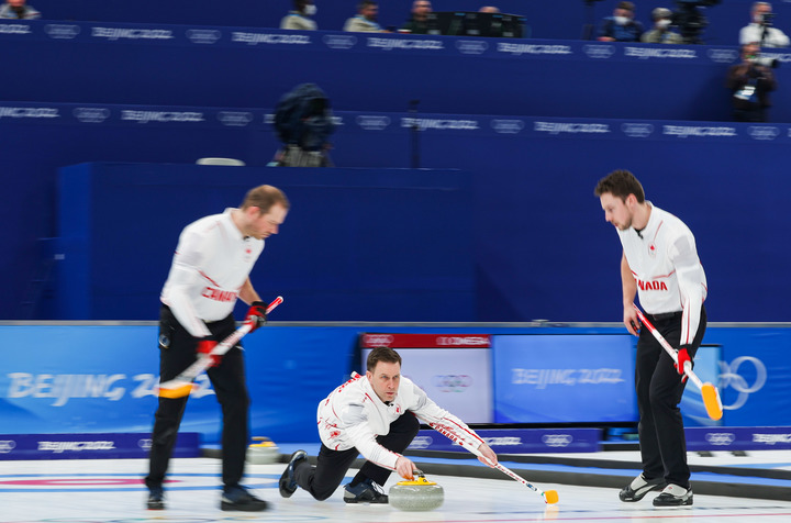 2月17日,加拿大队选手布拉德·古休(中)在北京2022年冬奥会男子冰壶半决赛中。新华社记者王婧嫱摄