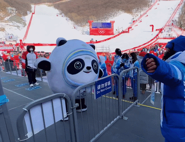 在高山滑雪女子回转比赛间隙,一名志愿者在赛场边学冰墩墩跳舞,而冰墩墩“本墩”也不甘示弱,“一人一墩”现场斗起舞来,冰墩墩秀出的舞技虽不算高超,但也颇有些街舞范,气氛一下子被调动起来。