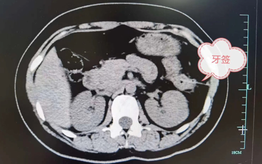 右上:误吞牙签刺破胃壁