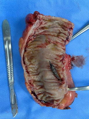 老太太被送入手术室,在急诊全麻下行腹腔镜剖腹探查手术,大肠外科李军主任医师通过精湛的技术,找到了导致肠穿孔的罪魁祸首——一颗小小的枣核。