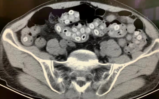 老太太平时身体很好,做起家务活来非常麻利。三天前的午后,老太太出现有下腹部阵发性绞痛,同时伴随有呕吐、腹泻、畏寒、发热。当时没有特别重视,以为是吃坏了什么东西,过几天就自然好了。直到一天前,症状愈发危重,去到当地医院就诊,一查CT,情况不妙——大肠破了,但是什么原因导致的不得而知。医生告知家属病情加重,随时有生命危险,而此时老太太精神状态也变得疲软,心跳血压也明显升高,商量后立刻转至浙大二院。