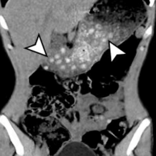 右下:吞入大量奶茶珍珠引起胃肠梗阻