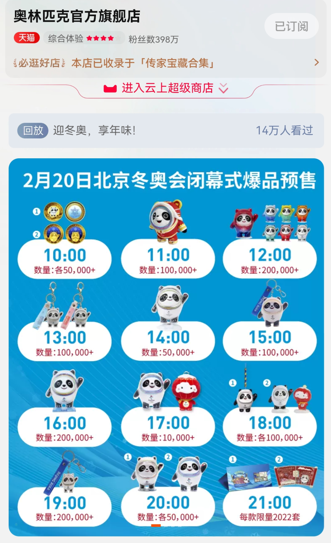 记者了解到,20日上午10时至晚上9时,天猫奥林匹克官方旗舰店将在每个整点,轮番发售平均十万只冰墩墩,相当于1天集中补货一百万只冰墩墩,这也是冰墩墩补货力度最大的一次。