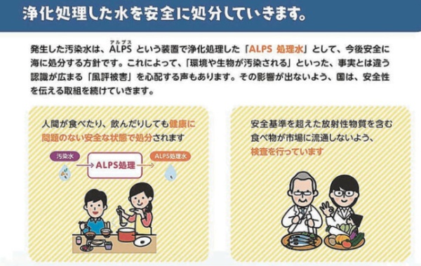 传单部分内容,称核污染水经过处理后人类喝了也不会对健康造成影响,日本政府还会监督核辐射超标食品不会流入市场。图自《河北新报》