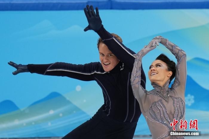 2月7日,北京2022年冬奥会花样滑冰团体赛冰上舞蹈自由舞比赛在首都体育馆举行。图为美国选手麦迪逊·乔克(右)、埃文·贝茨在比赛中。