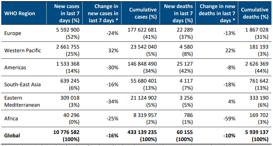 报告指出,2月21日至2月27日期间,全球新增新冠肺炎确诊病例超过1000万例,较前一周减少16%,新增死亡病例数同样呈现下降趋势,降幅为10%。除西太平洋区域新增确诊病例增加32%,其他各区域新增确诊病例均有所减少,其中东地中海区域降幅最大,新增确诊病例较前一周减少34%,其次是美洲区域和非洲区域。