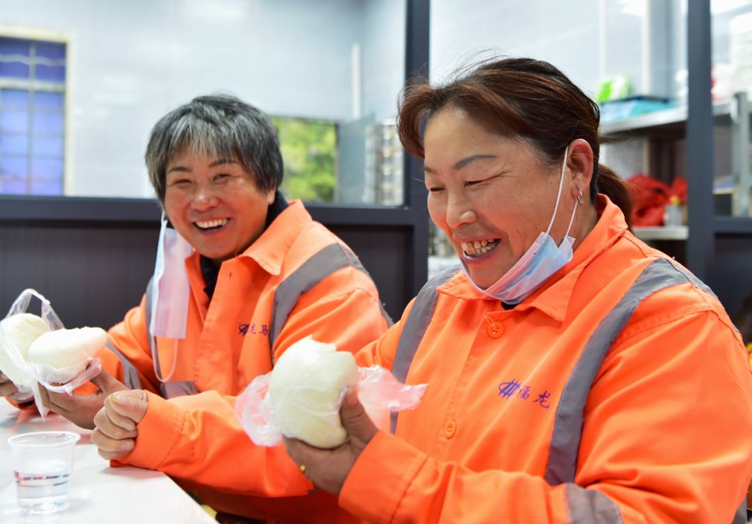 3月5日,石狮环卫工人王美英(右)和同事在馒头店里品尝爱心馒头。新华社记者魏培全摄