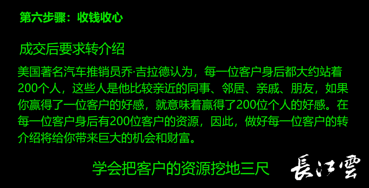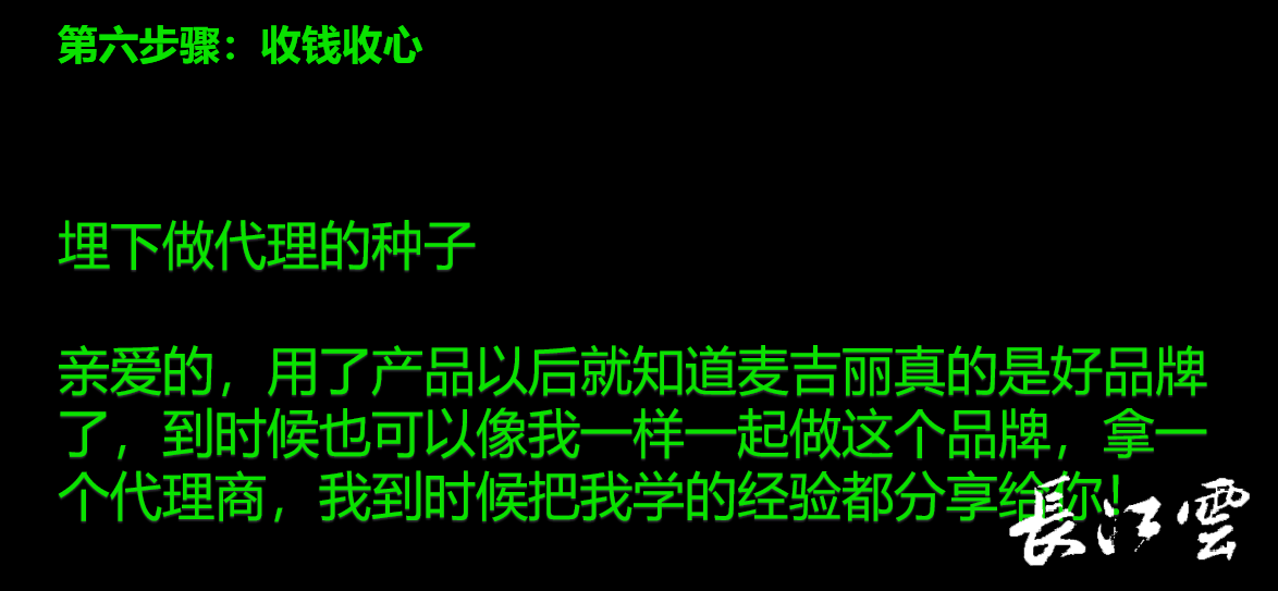 如何收钱又收心?在课件的最后一个篇章,还有教代理商们如何“收钱收心”的内容。比如“成交后要求转介绍”、“做好每一位客户的转介绍将给你带来巨大的机会和财富”、“学会把客户的资源挖地三尺”。以及“埋下做代理的种子”、“亲爱的,用了产品以后就知道麦吉丽真的是好品牌了,到时候也可以像我一样一起做这个品牌,拿一个代理商,我到时候把我学的经验都分享给你!”等。