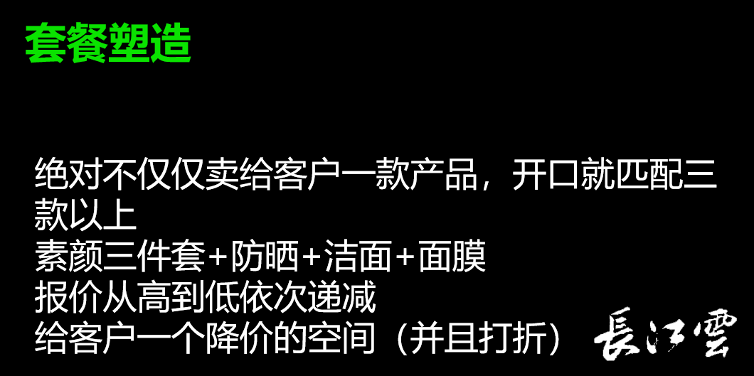 如何售卖套餐?课件介绍:“绝对不仅仅卖给客户一款产品,开口就匹配三款以上”、“报价最高到底依次递减”、“给客户一个降价的空间(并且打折)”等。