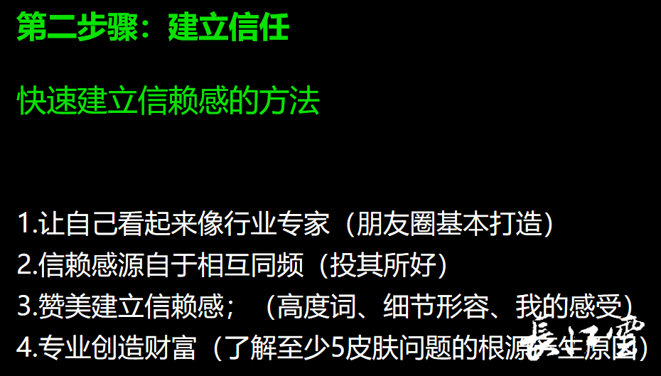 如何建立信任关系?课件介绍,“让自己看起来像个行业专家(朋友圈基本打造)”、“信赖感源自于相互同频(投其所好)”、“赞美建立信赖感”等。