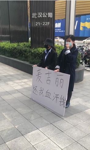 (2021年10月27日,两位报料人位于武汉汉街尊A座麦吉丽总部楼下进行维权)