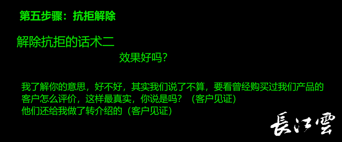 效果好吗?课件中解除抗拒的话术中提到:“我了解你的意思,好不好,其实我们说了不算,要看曾经购买过我们产品的客户怎么评价,这样最真实,你说是吗?(客户见证)他们还给我做了转介绍的(客户见证)”。