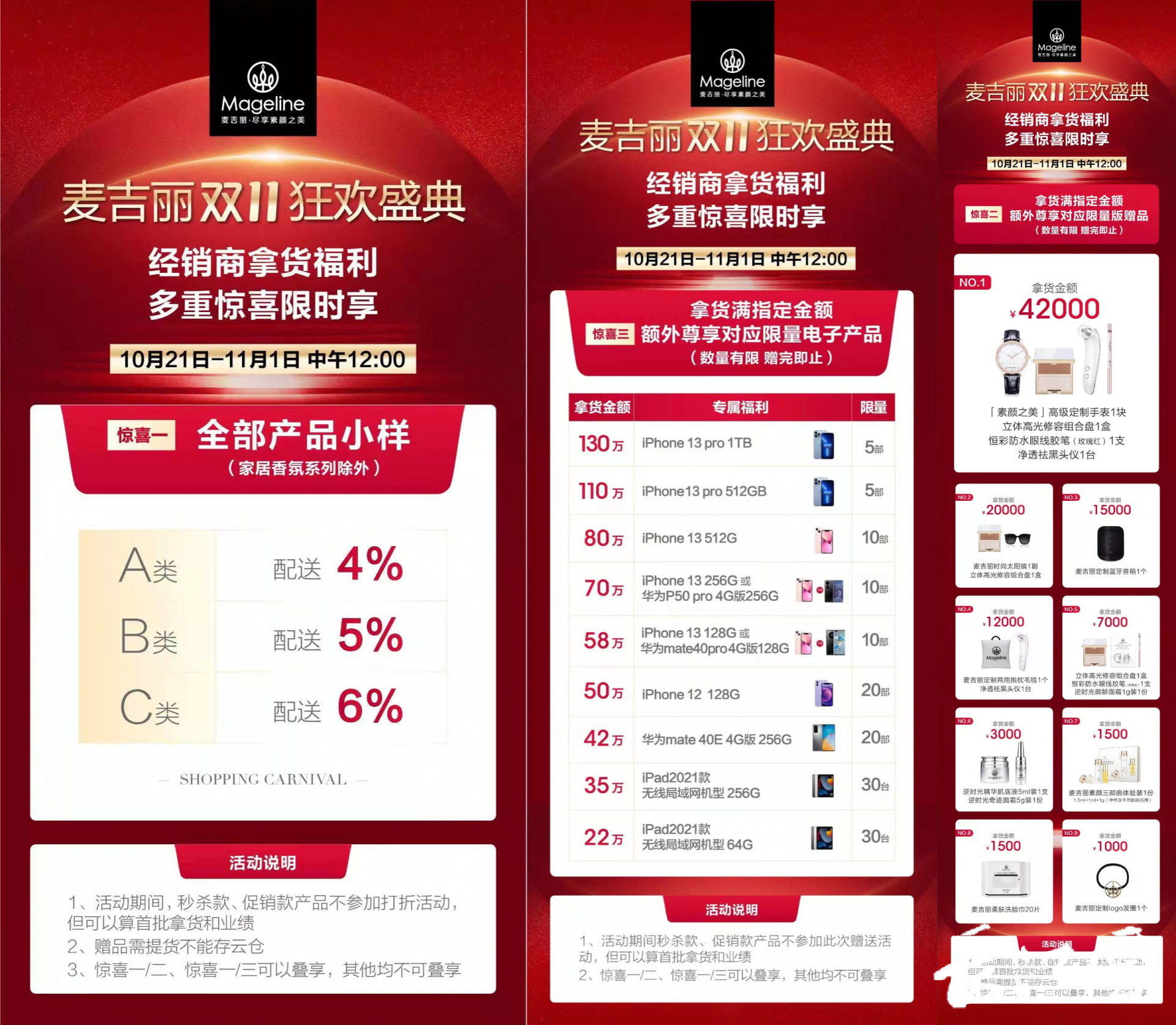 秦女士发来一张2021麦吉丽双十一经销商拿货福利图,称:“公司诱导代理商消费,就是搞拿货送赠品,甚至搞优惠。A、B、C分别是一、二、三级代理,其中A类级别最高。而配送比例代表每级代理商拿货优惠不同,比如说A类进100块钱的货优惠4块钱,B类进100块钱的货优惠5块钱,以此类推。在麦吉丽,只要买的多,卖的多,代理级别就容易升上去。”