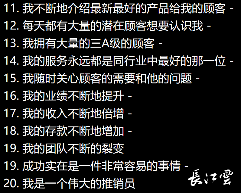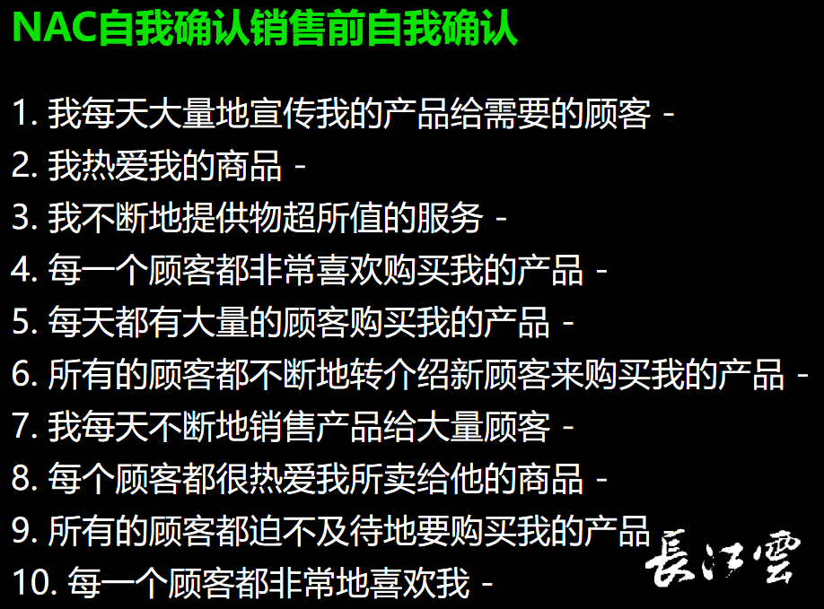 如何提升售前信心?课件中有20条关于代理商自我心理暗示的话术:“我的业绩不断地提升”、“我的收入不断地倍增”、“我的团队不断地裂变”、“我是一个伟大的推销员”等等。