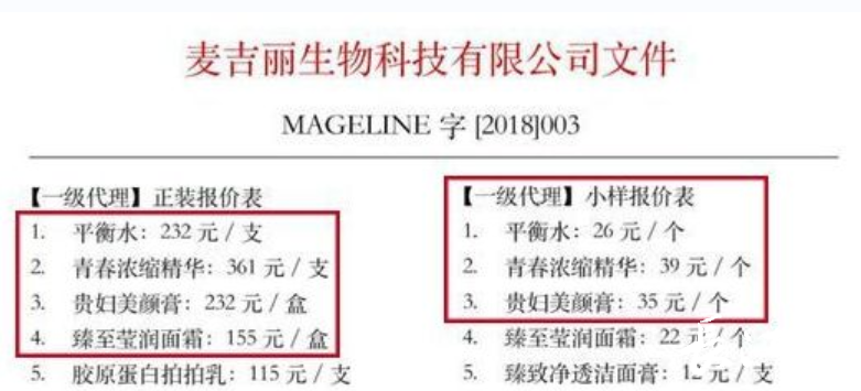 通过对比报料人提供的麦吉丽正装价格表和一级代理商进货报价表,可以看出两者之间溢价巨大。比如一个官方售价1280元的青春浓缩精华,一级代理商进货仅361元。