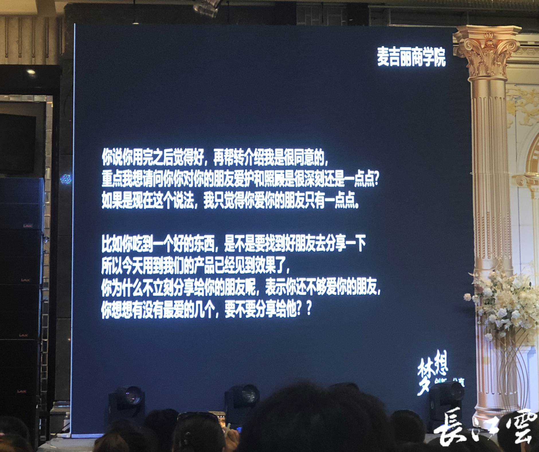 麦吉丽商学院的大屏幕上写着:“你为什么不立刻分享给你的朋友呢,表示你还不够爱你的朋友,你想想有没有最爱的几个,要不要分享给他?”,“‘讲大事’的人不一定会成功、成功的人一定能‘讲大事’,讲到自己魂牵梦绕、讲到别人无法考证。”在报料人提供的PPT里,还能看到“你能销售给多少人,就能领导多少人”等字眼。