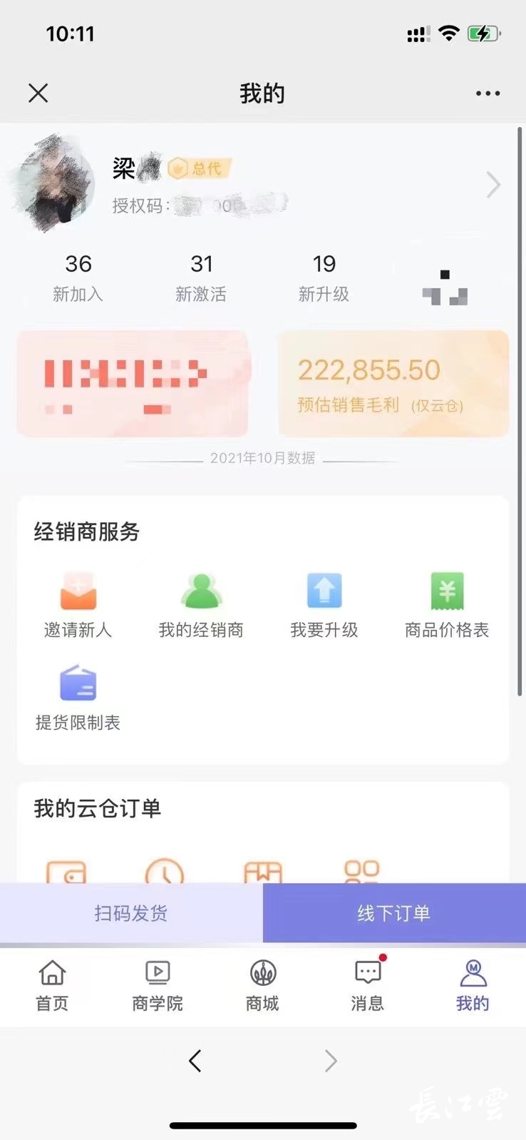 梁姓总代称,她的下级有1000多个代理商。在她的朋友圈,记者发现了一张她的系统界面截图,显示:新加入36人、新激活31人、新升级19人等信息。秦女士对此解释到:“就是36个新加入的代理,31个激活系统的老代理,19个打款补押金升级的新代理。”