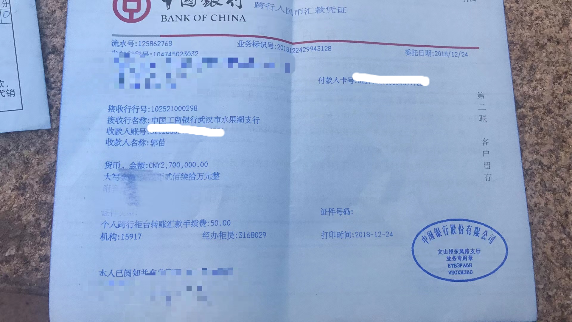 (2018年12月24日余先生打给郭苗个人账户的汇款凭证)