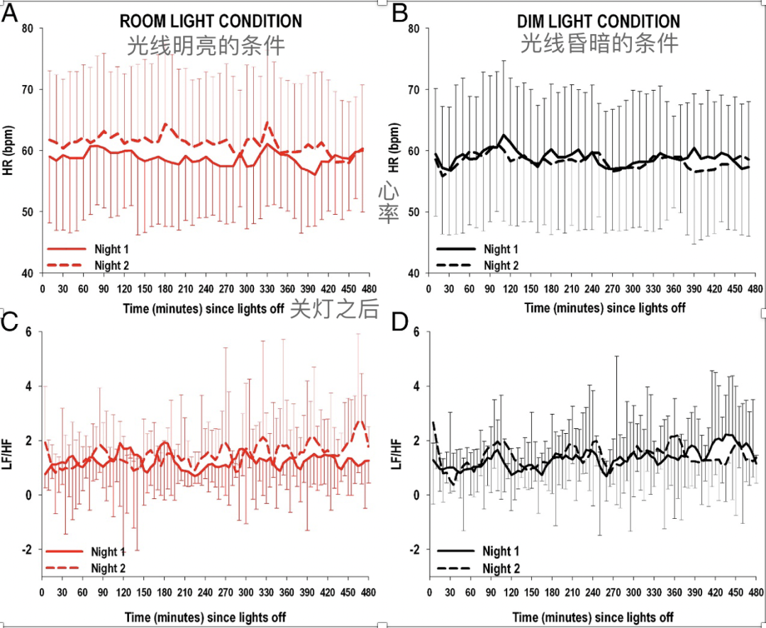 结果发现,在开灯睡觉的情况下,被试者的心率在整晚都有明显的提升,小心脏扑通扑通地跳着。