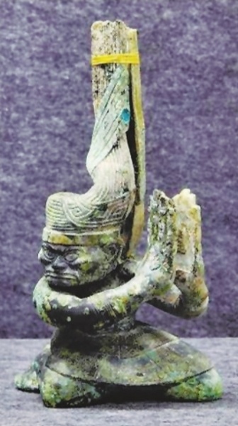 三星堆遗址4号坑出土的铜扭头跪坐人像。