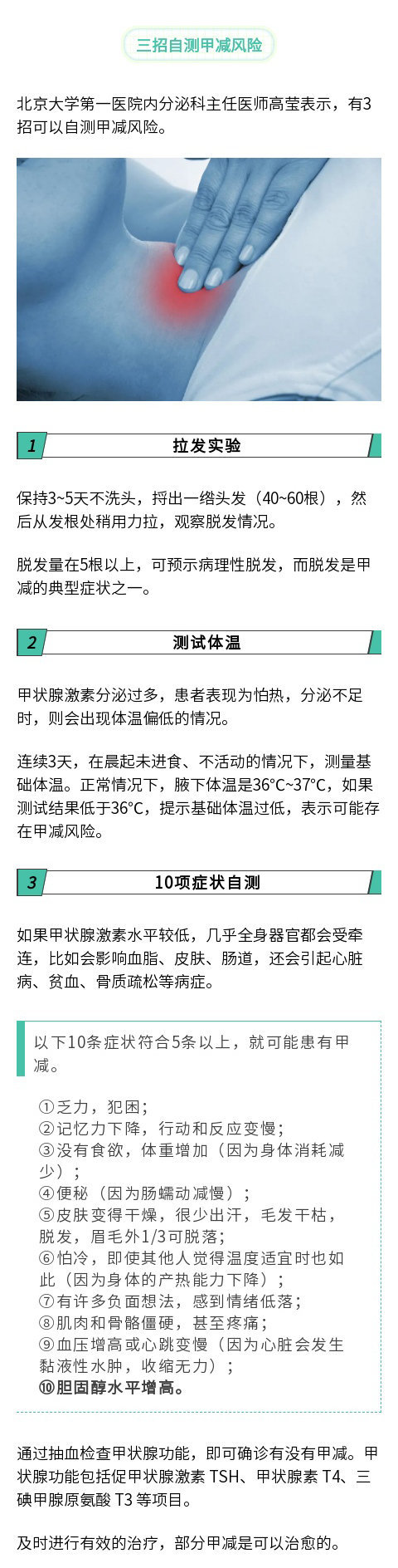 甲状腺位于“喉结”下方2~3厘米处,是人体最大的内分泌器官。甲状腺激素分泌过多,会让人精神亢奋;没有足够的甲状腺激素,则会萎靡不振,干什么都没精神。甲状腺功能减退会导致身体代谢水平降低,如果经常感觉睡不醒,困倦乏力,做什么都没干劲儿,就要考虑到甲减的可能。