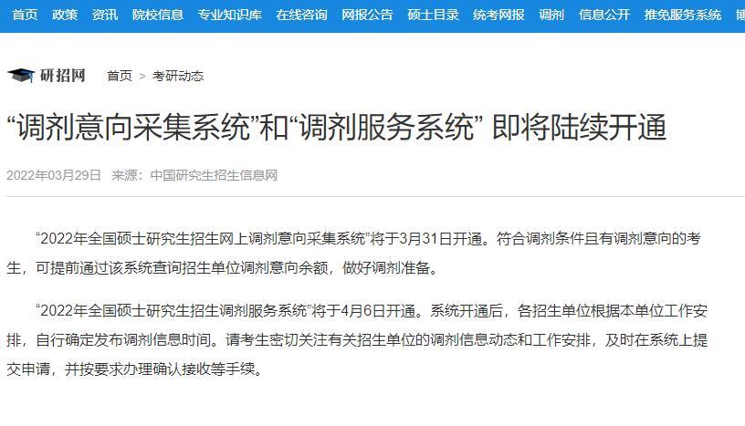 据研招网消息,“2022年全国硕士研究生招生网上调剂意向采集系统”将于3月31日开通。符合调剂条件且有调剂意向的考生,可提前通过该系统查询招生单位调剂意向余额,做好调剂准备。