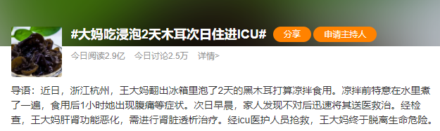 今天(3月29日),一则#大妈吃浸泡2天木耳次日住进ICU#的话题冲上热搜。