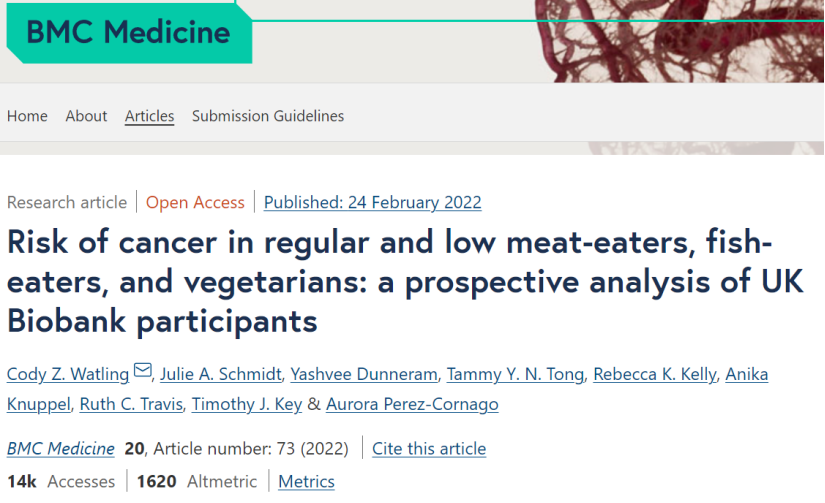 ①2021-02-25中国营养学会《中国居民膳食指南2021》②Watling, Cody Z., et al. "Risk of cancer in regular and low meat-eaters, fish-eaters, and vegetarians: a prospective analysis of UK Biobank participants." BMC Medicine 20.1 (2022): 1-13.
