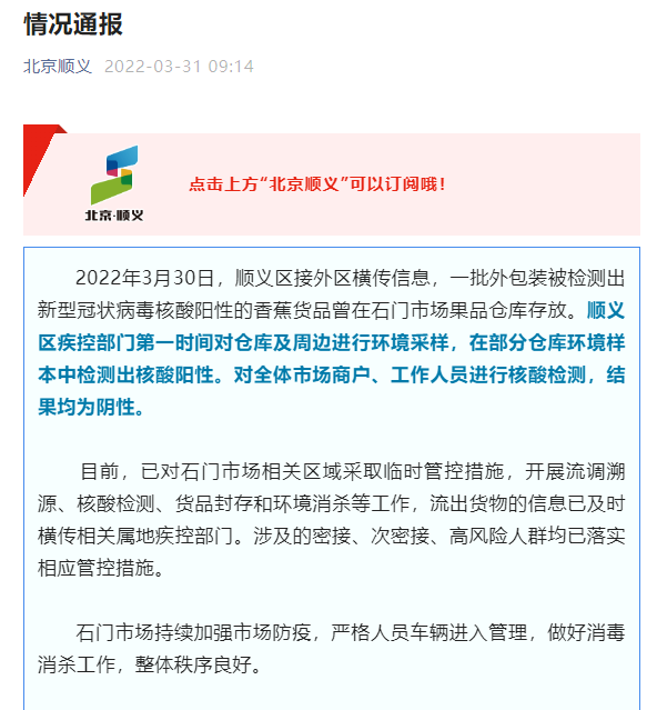 据北京市顺义区疾病预防控制中心通报,2022年3月30日,顺义区接外区横传信息,一批外包装被检测出新型冠状病毒核酸阳性的香蕉货品曾在石门市场果品仓库存放。顺义区疾控部门第一时间对仓库及周边进行环境采样,在部分仓库环境样本中检测出核酸阳性。对全体市场商户、工作人员进行核酸检测,结果均为阴性。