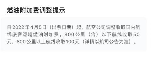 2022年3月5日,燃油附加费再度上涨,800公里(含)以下航段,每位成人旅客收取20元燃油附加费;800公里以上航段,每位成人旅客收取40元燃油附加费。