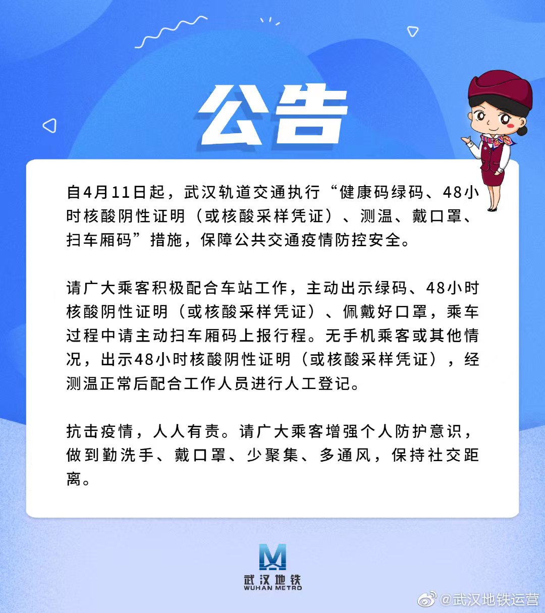 自4月11日起,武汉轨道交通执行“健康码绿码、48小时核酸阴性证明(或核酸采样凭证)、测温、戴口罩、扫车厢码”措施,保障公共交通疫情防控安全。