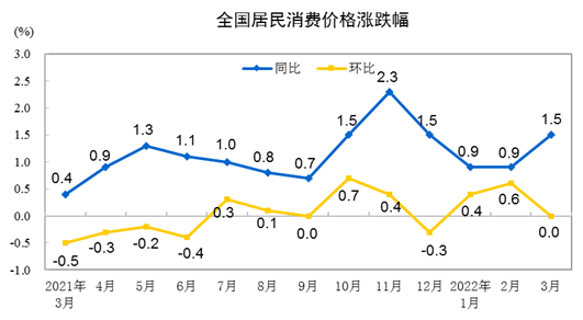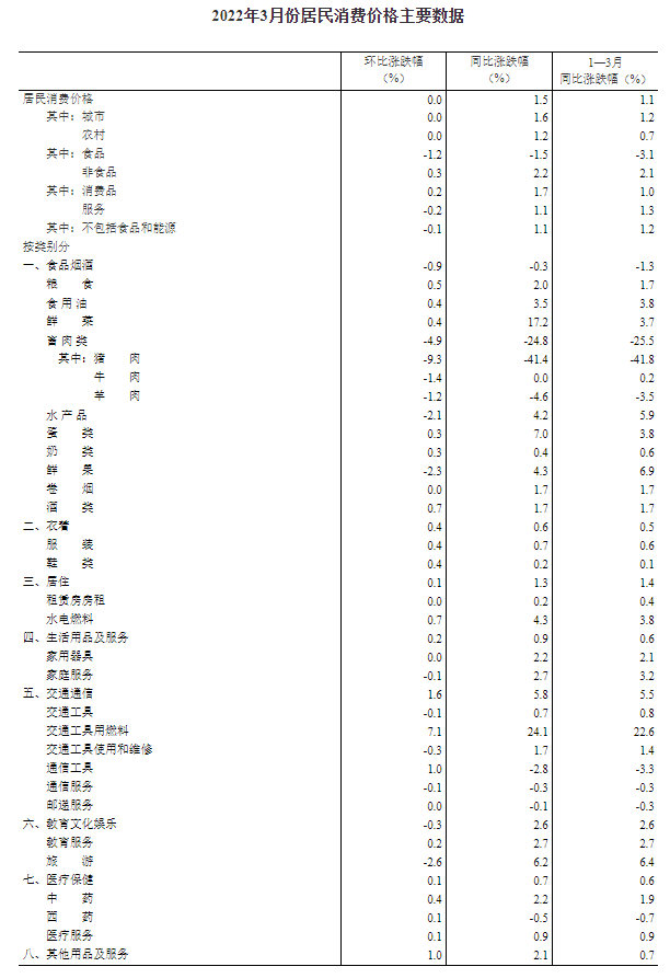 2022年3月份,全国居民消费价格同比上涨1.5%。其中,城市上涨1.6%,农村上涨1.2%;食品价格下降1.5%,非食品价格上涨2.2%;消费品价格上涨1.7%,服务价格上涨1.1%。1—3月平均,全国居民消费价格比上年同期上涨1.1%。