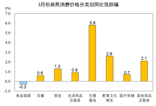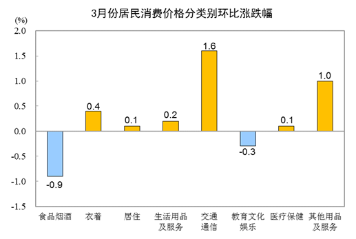3月份,食品烟酒类价格环比下降0.9%,影响CPI下降约0.26个百分点。食品中,畜肉类价格下降4.9%,影响CPI下降约0.15个百分点,其中猪肉价格下降9.3%,影响CPI下降约0.12个百分点;鲜果价格下降2.3%,影响CPI下降约0.05个百分点;水产品价格下降2.1%,影响CPI下降约0.04个百分点;粮食价格上涨0.5%,影响CPI上涨约0.01个百分点;鲜菜价格上涨0.4%,影响CPI上涨约0.01个百分点。