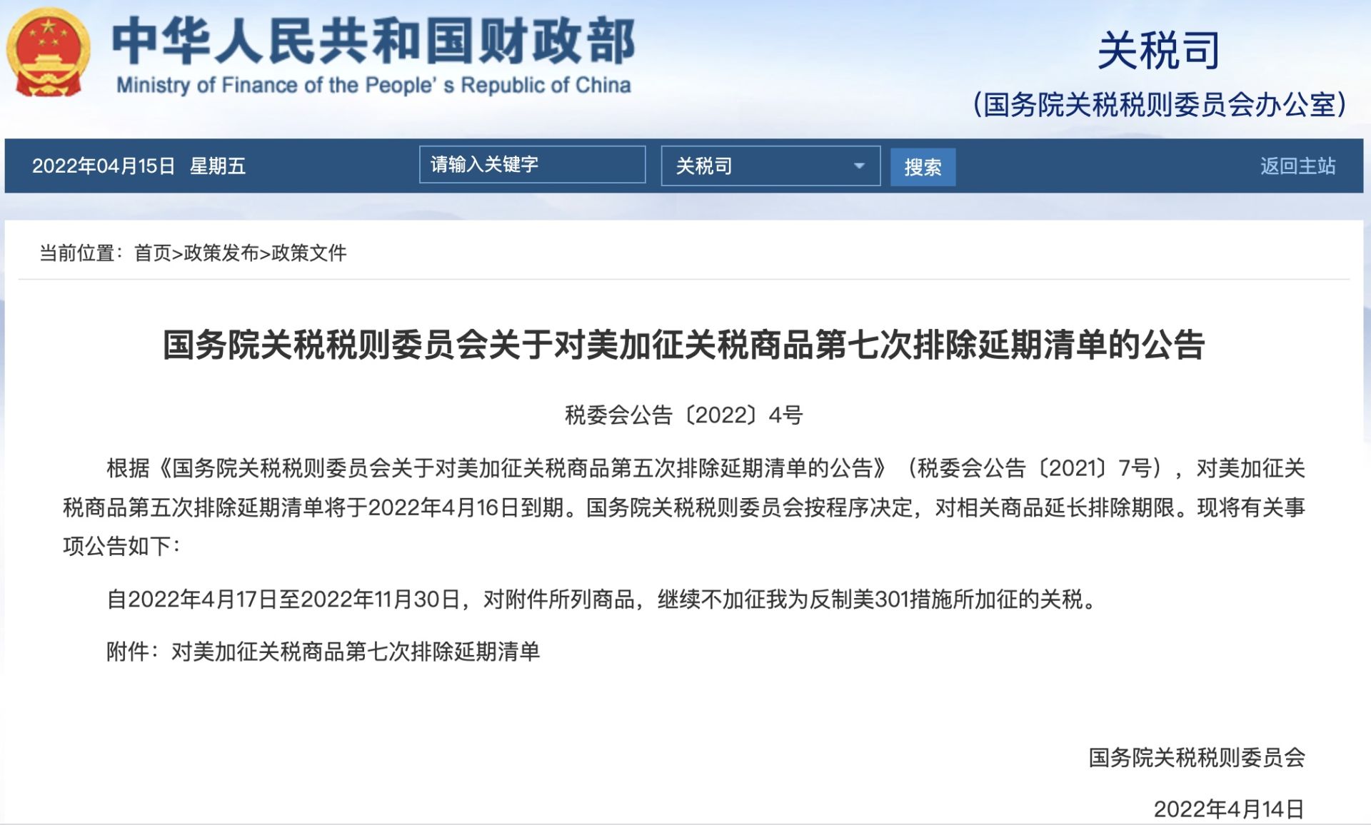 自2022年4月17日至2022年11月30日,对附件所列商品,继续不加征我为反制美301措施所加征的关税。