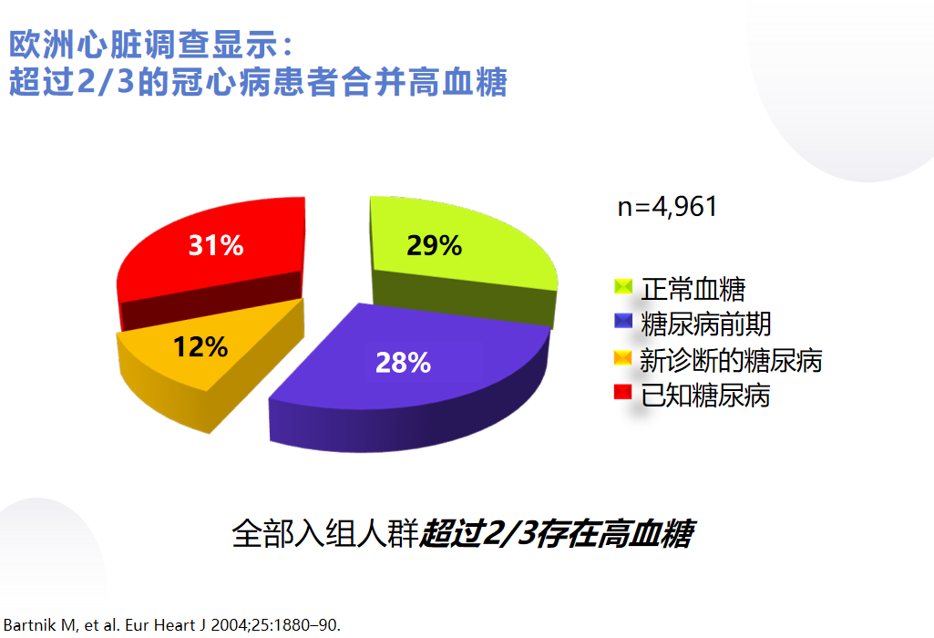 研究发现,餐后血糖的升高与糖尿病并发症的发生关系更为密切。例如,在欧洲的一项心脏调查研究中,超过三分之二的冠心病患者合并有高血糖,其中28%的患者是糖尿病前期,31%的患者既往已知患有糖尿病,还有12%的患者是发现冠心病后再进行OGTT新诊断的糖尿病。该调查还显示,如果不进行OGTT检查,将漏诊约三分之二的糖代谢异常患者。
