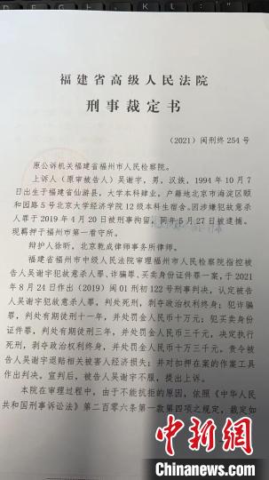 2021年8月,福州市中级人民法院作出一审判决:吴谢宇犯故意杀人罪、诈骗罪、买卖身份证件罪,数罪并罚,决定执行死刑,剥夺政治权利终身,并处罚金人民币十万三千元。